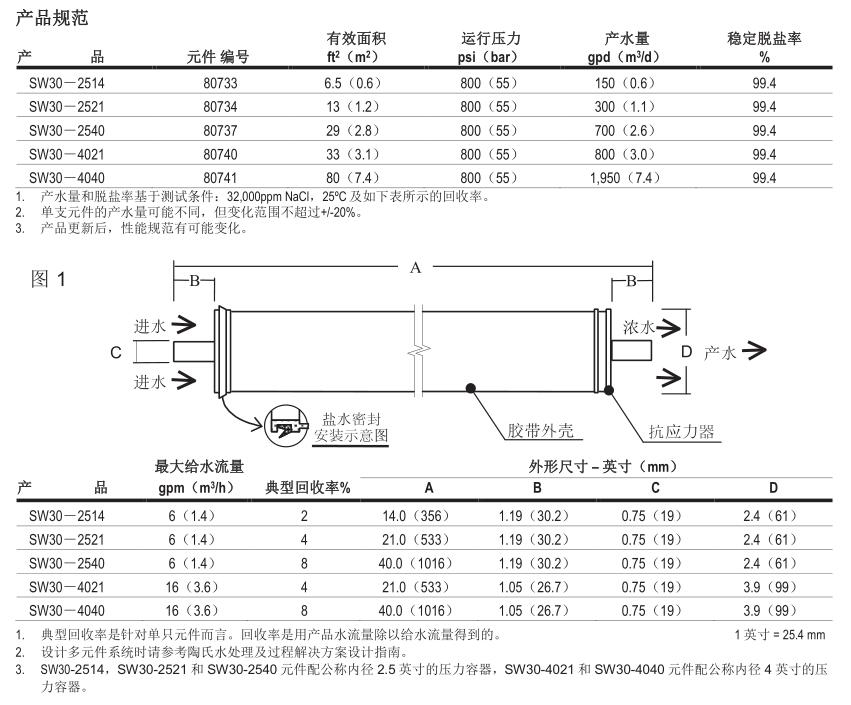 ● 陶氏 FILMTEC TM SW30的元件產(chǎn)水量大,以滿足海上和陸地安裝的海水淡化的需要;