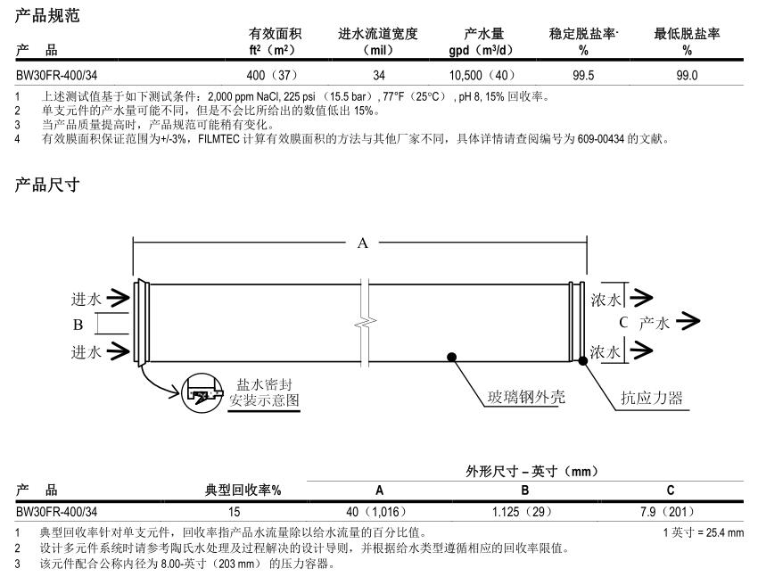 ●34mil的進水流道,降低了膜元件被污堵的幾率,并明顯提高了膜元件的清洗效果。